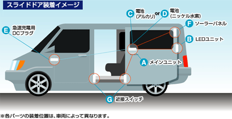 LEDスライドドアフラッシャーは突発的なドア開放においても、ドアを開いた瞬間にLEDが点灯し後方から来るクルマやバイク、自転車など、後方者にすばやく警告することができます。